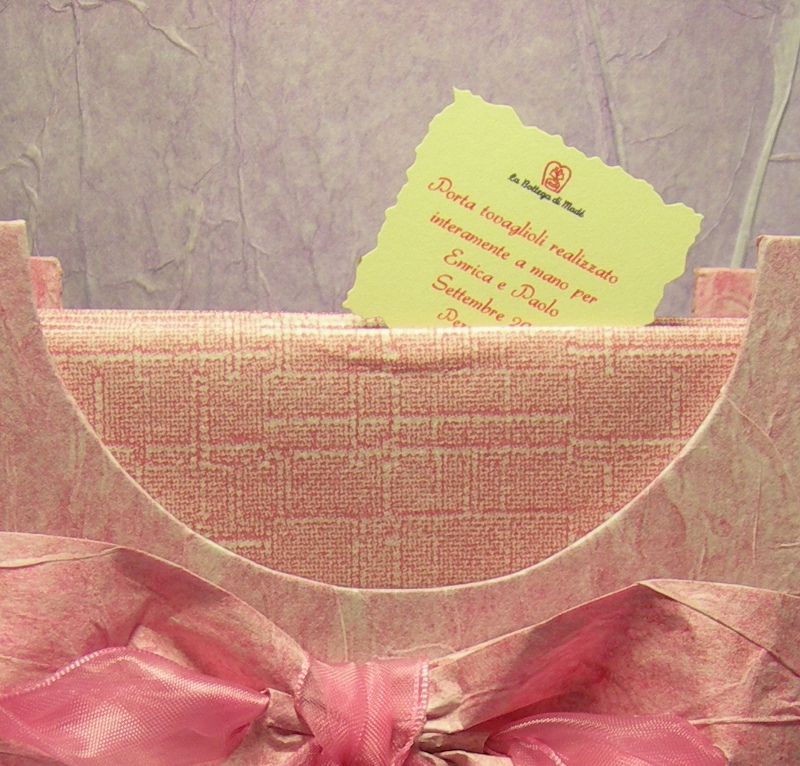 Porta tovaglioli rivestiti con carta goffrata realizzata dalla Bottega. Pezzo unico per Enrica e Paolo.Particolare.