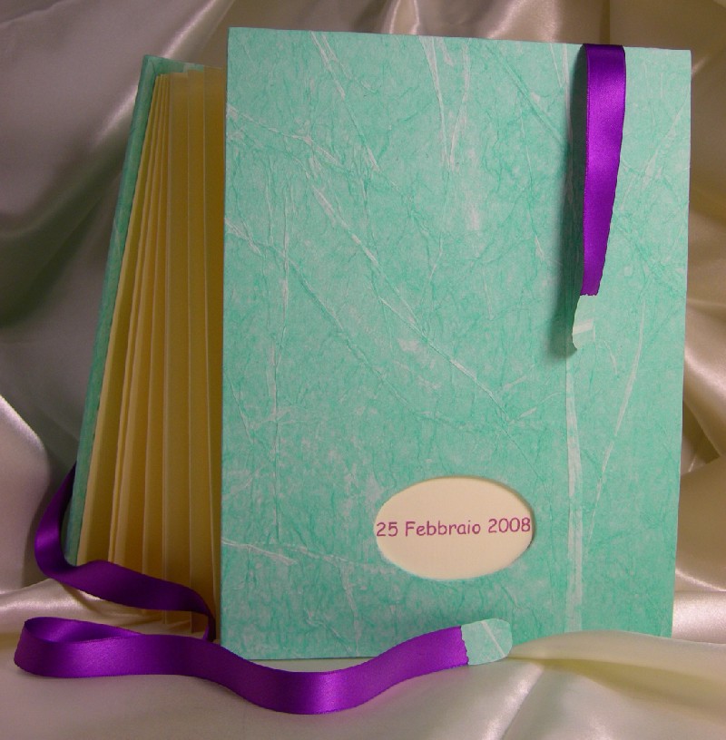 Album a fisarmonica rivestito in carta goffrata realizzata a mano.