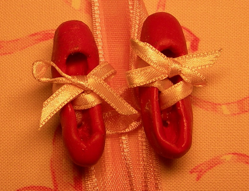 Cofanetto dei ricordi di Sookie e Brie; particolare della chiusura: scarpine da ballo in pasta Fimo realizzate a mano.
