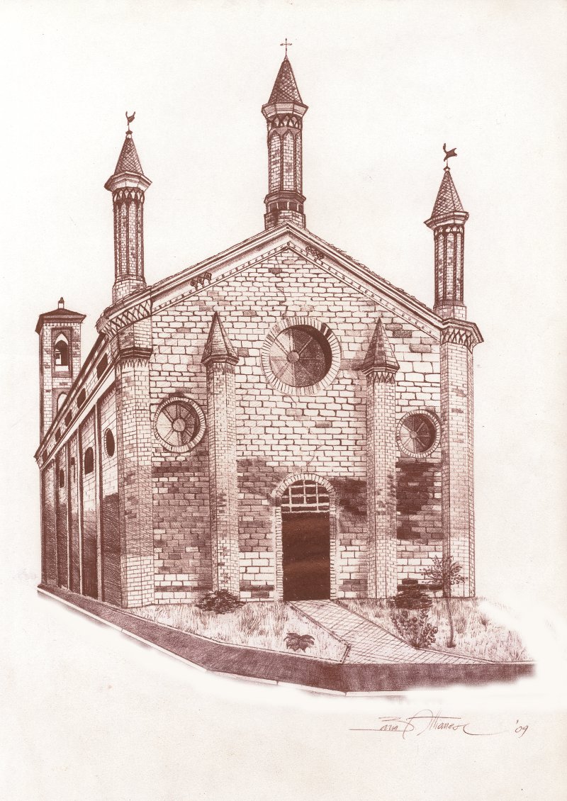 Chiesa di Santa Maria Maddalena. Disegno di Maria Attianese. La nuova sede della Bottega è in via 11 febbraio, al n. 35, a Cremona, appena terminata la chiesa di Santa Maria Maddalena, nella sede dell'ex oratorio femminile della Parrocchia di S. Imerio