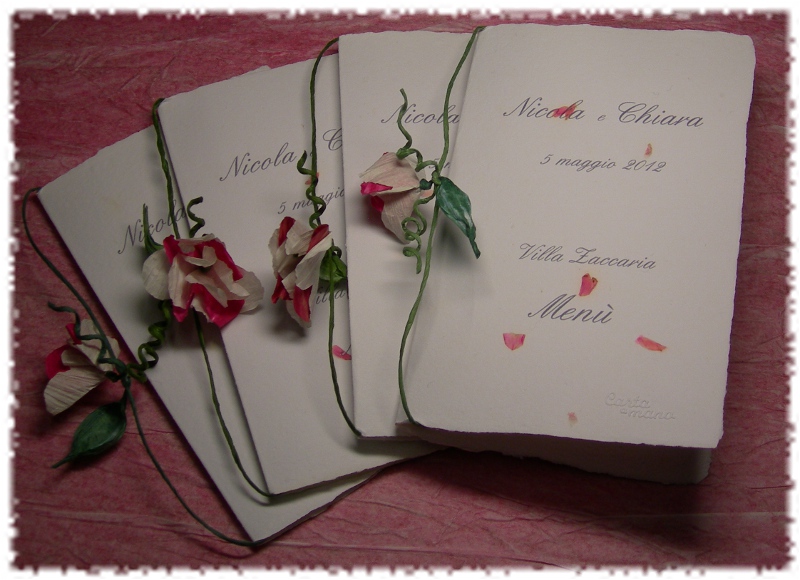 Menù per Nicola e Chiara, decorati con fiori in filo di carta finlandese.