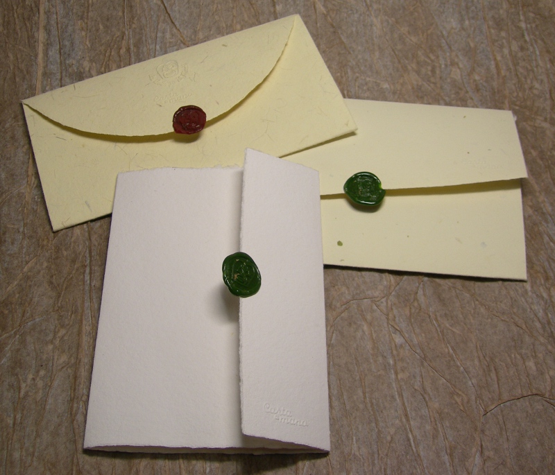 Partecipazione in carta a mano, realizzata a telaio, secondo le antiche tecniche dei mastri cartai medioevali. tre diverse interpretazioni del modello Busta lettera.