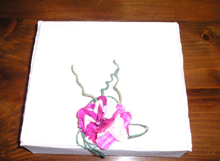 Cofanetto in carta a mano e chiusura con fiori in filo di carta finlandese.