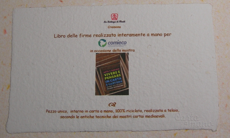 dal 12 aprile al 29 maggio,2011, Museo Diocesano. Interno in carta a mano, 100% riciclata, realizzata a telaio, secondo le antiche tecniche dei mastri cartai medioevali.